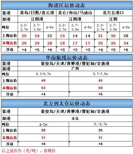 北方到太仓航线4-5万运价上涨6元; 5-5.7万吨运价上涨6元;