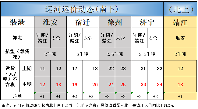 济宁到江阴/靖江运价上涨2元为33元/吨;
