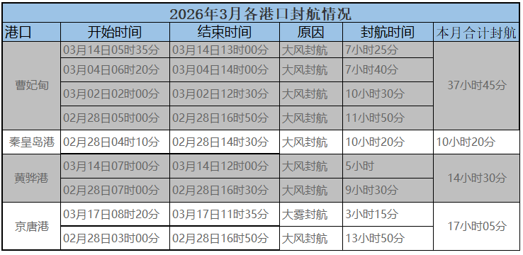 2026年3月17日,近期曹妃甸、黄骅港有短时间大风封航,京唐港短时间大雾封航,其他北方港口暂无封航,具体如下。