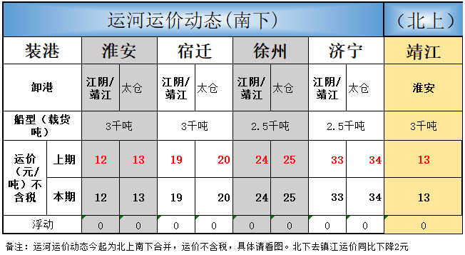 周二运河各主要航线运价均暂维稳。。