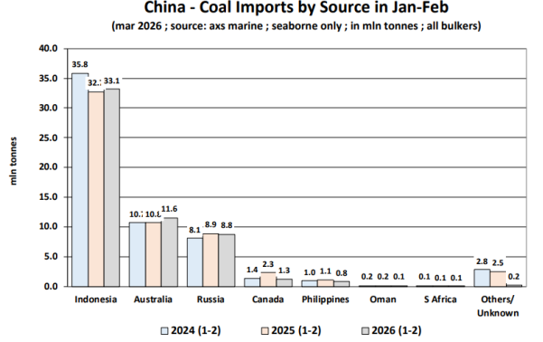 据船舶经纪与服务集团班切罗・科斯塔(Banchero Costa)最新发布的市场周报(MARKET REPORT – WEEK 10/2026),其援引AXS Marine船舶运输跟踪数据显示,2026年1-2月,全球海运煤炭装船量(不包括各国国内沿海货物运输)累计为1.98亿吨,较去年同期下降1.0%。