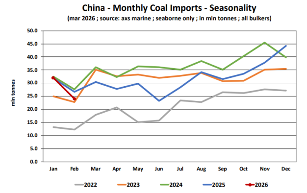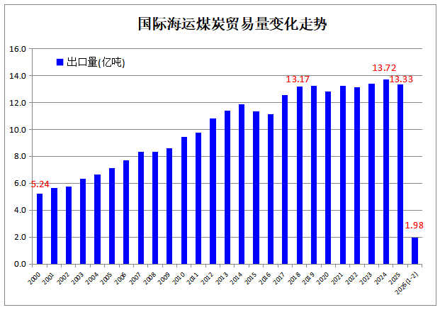 2026年1-2月,中国海运煤炭进口量继续下降至5600万吨,较2025年同期的5860万吨下降4.4%。