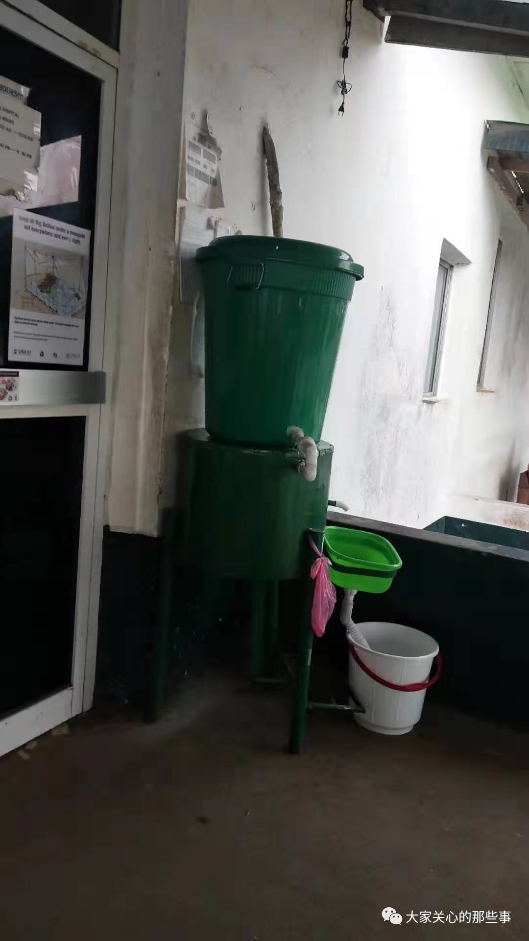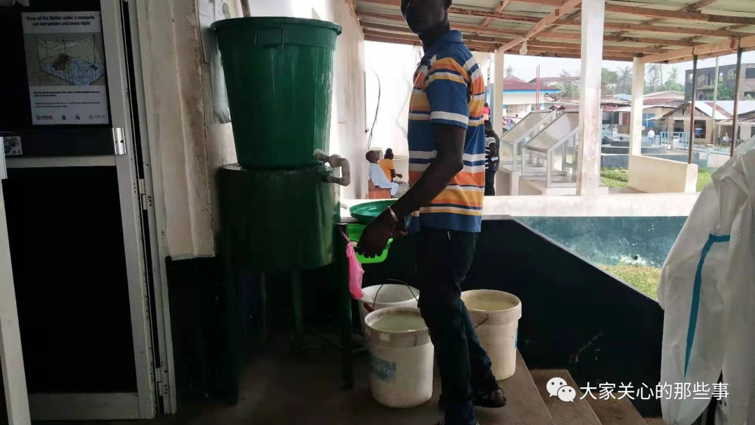 2个用木架搭起来的棚子供病人休息:还有几个水桶到处放着,可能用来洗手的吧。