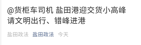盐田政法发布:2月4日,疏港通道已实施限行,实行东进东出(B闸口),西进西出(A闸口)。如无必要,年前出行应尽量避开走盐排高速、惠盐高速(北山道和明珠道)及盐坝高速,以免耽误行程。出货请司机合理安排时间,错峰交货、提柜,文明出行。