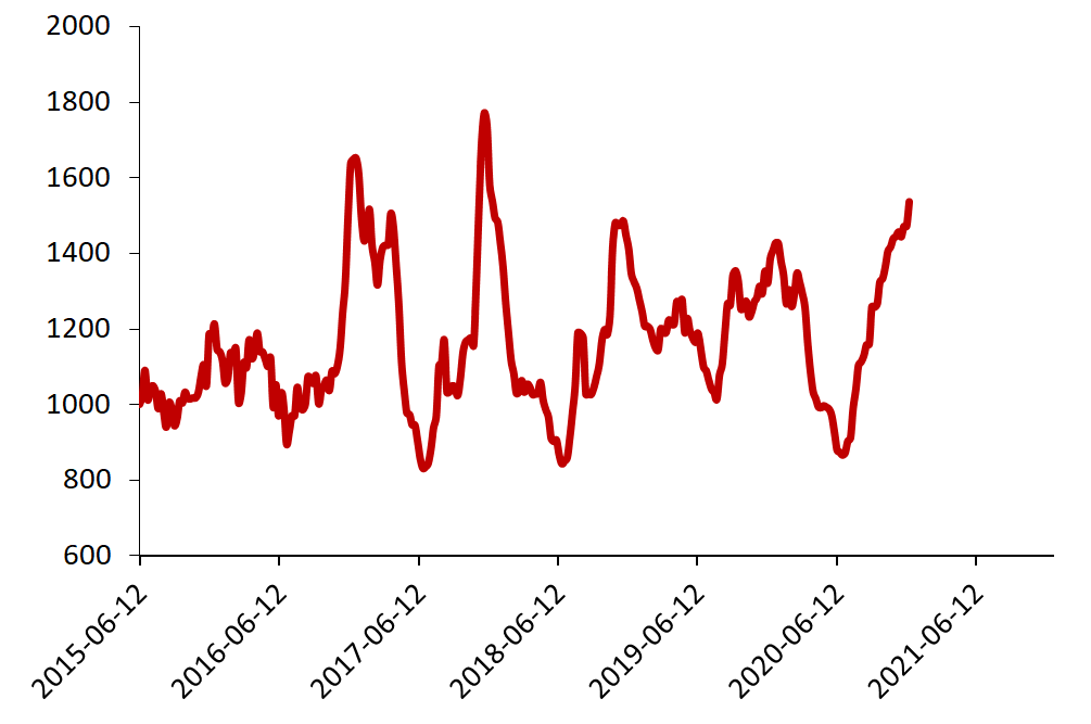2015-2021年中国内贸集运市场运价走势