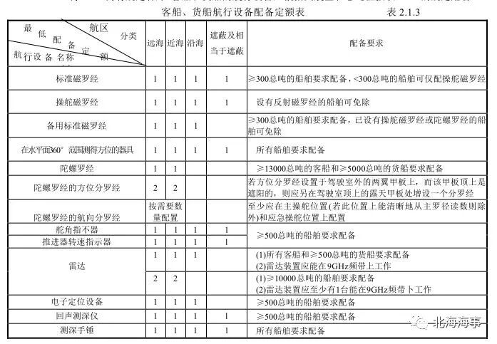 除 2.1.4另有规定者外,客船和货船的航行设备应根据其航区和总吨位按表2.1.3 的规定配备。