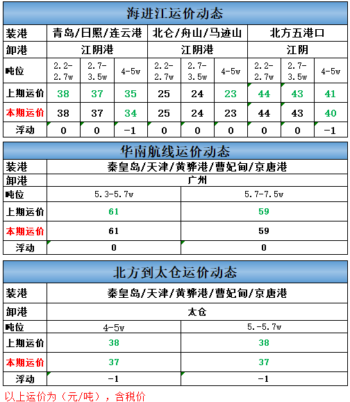 北方到太仓航线4-5万运价下跌1元; 5-5.7万吨运价下跌1元;