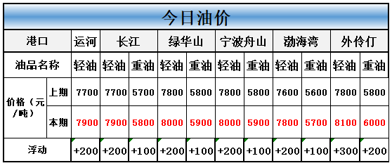 (绿色字体代表油价下调,红色字体代表油价上浮)