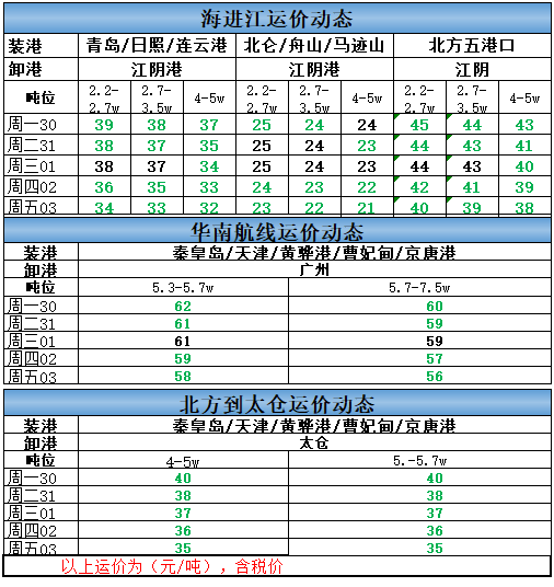 北方到太仓运价4-5.7万吨运价下跌6元为35元;
