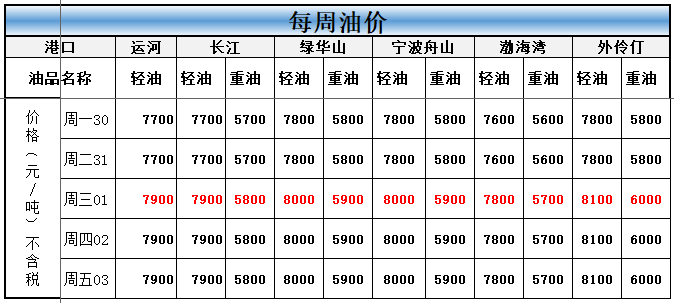 本周内外港船燃价格在周三均上调,其中轻油上浮200元/吨;重油上浮约100元/吨。其他时间油价维持在高位暂未变动;