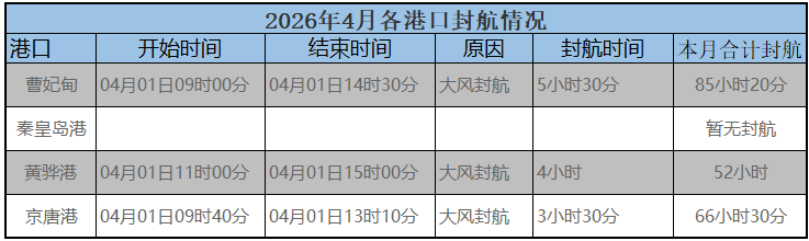 2026年4月上旬,近期除秦皇岛港外北方各大港口均有短时大风封航,具体如下。