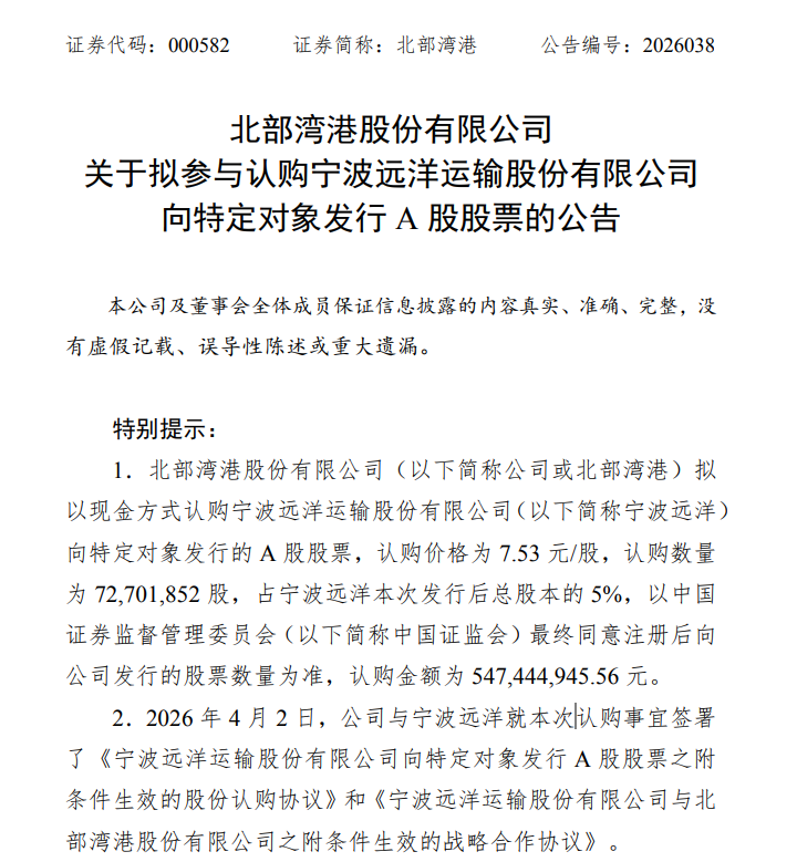4月2日,北部湾港股份有限公司(简称北部湾港)发布公告,拟以现金方式,认购宁波远洋运输股份有限公司(简称宁波远洋)向特定对象发行的A股股票,认购价格为7.53元/股,认购数量为72,701,852股,占宁波远洋本次发行后总股本的5%,认购金额为547,444,945.56元。